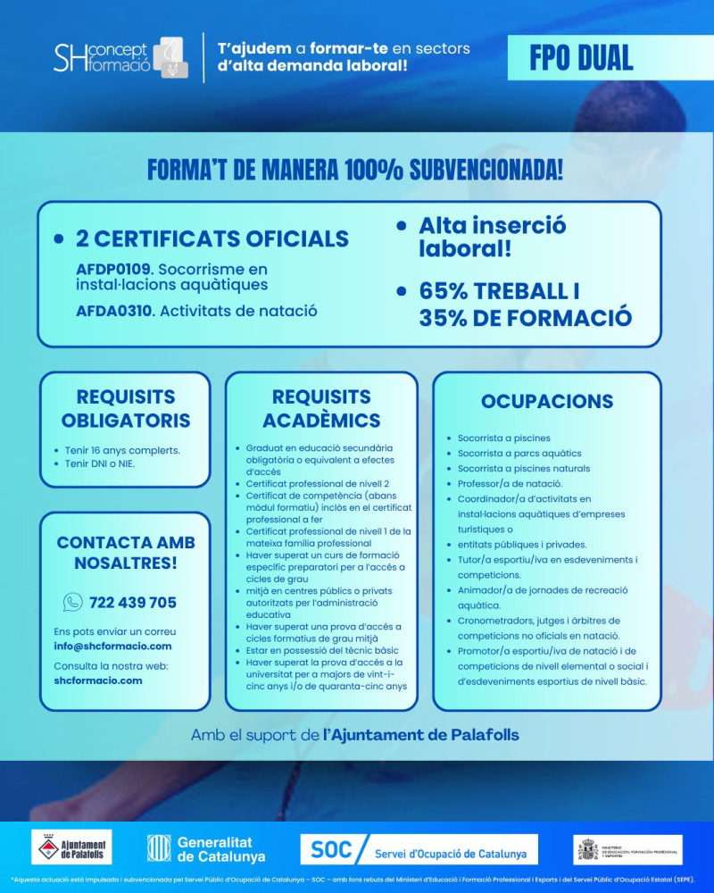 L’Ajuntament de Palafolls, en col·laboració amb el centre SH Concept Formació, impulsa una nova edició del Programa de Formació Professional per a l’Ocupació (FPO) DUAL en les especialitats de Socorrisme aquàtic i Tècnic/a en activitats de natació. Aquest projecte, 100 % subvencionat pel Servei d’Ocupació de Catalunya (SOC) amb fons del Servicio Público de Empleo Estatal (SEPE), arrencarà a finals de novembre, amb la selecció dels candidats, i permetrà als i les alumnes esdevenir professionals en instal·lacions aquàtiques. Objectius i requisits El programa té dos eixos principals: d’una banda, millorar l’ocupabilitat de les persones joves i majors de 29 anys amb dificultats per accedir al mercat de treball en situació d’atur, amb baix nivell formatiu o sense qualificació; de l’altra, dotar les empreses del sector aquàtic de professionals formats i qualificats, atenent la dificultat de trobar personal especialitzat. Les places són limitades (15 en total) i els requisits inclouen el graduat d’ESO o equivalent, estar inscrits al Servei d’ocupació de Catalunya (SOC) com a demandant d’ocupació no ocupat (DONO). Així com complir tots els requisits legals per poder formalitzar un contracte de formació en alternança. També caldrà superar una prova de natació (200 m en 4 minuts) i una entrevista personal. Contingut del programa i titulacions El programa preveu una formació de 1120 hores que permetrà obtenir dos Certificats de Professionalitat: La part teòrica de la formació s’impartirà al centre Can Batlle i la pràctica a la piscina del CEM Tordera. El contracte serà de formació en alternança amb una durada prevista de 12 mesos (1.170 hores de treball), combinant formació (35%) i experiència laboral efectiva (65%). Inscripció El procés de selecció es troba obert durant aquests darrers dies d’octubre i el mes de novembre, fins a cobrir les 15 places disponibles. Cal emplenant el formulari de preinscripció complint tots els requisits i superar la prova de natació i l’entrevista. La formació començarà a principis del mes de gener del proper any i permetrà treballar com a socorrista a piscines, parcs aquàtics fer de professor de natació, animador aquàtic o d'àrbitre en competicions oficials entre d’altres.