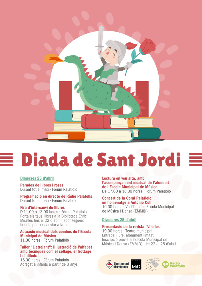 El proper dimecres 23 d'abril se celebra la Diada de Sant Jordi arreu de Catalunya i Palafolls, com no podia ser d'una altra manera, tornarà a omplir-se de llibres, roses i activitats culturals per a tots els públics. El Fòrum Palatiolo, com a eix central de la celebració, acollirà durant tot el matí parades de llibres i roses. Ràdio Palafolls traslladarà el seu equip a la mateixa plaça, per emetre un programa especial en directe. D'11.00 a 13.00 hores es podrà gaudir, allà mateix, de la Fira d'intercanvi de llibres de la Biblioteca Enric Miralles. L'equipament municipal recull exemplars en bon estat fins el 22 d'abril, que es podran bescanviar per llibres nous durant la diada. A les 11.30 hores, serà el torn de l'Escola Municipal de Música, que oferirà l'actuació dels seus combos. A la tarda, a partir de les 16.30 hores, la biblioteca realitzarà el taller "Lletrejant", d'il·lustració de l'alfabet amb tècniques com el collage, el frottage i el dibuix. L'activitat, a càrrec de Jana Comas, s'adreça a infants a partir de 3 anys. Paral·lelament, els Maduixots, els Castellers de l'Alt Maresme i la Selva marítima, oferiran un taller pràctic a la mateixa plaça. De 17.00 a 18.30 hores, es podrà gaudir de la lectura de diversos relats en veu alta, amb l'acompanyament musical de l'alumnat de l'Escola Municipal de Música. La jornada finalitzarà al vestíbul de l'EMMiD a les 7 de la tarda, amb el concert de la Coral Palatiolo, enguany en homenatge a Antonio Coll. D'altra banda, i fora del dia assenyalat, el divendres 25 el consistori farà la presentació pública del nou número de la revista municipal "Vilelles". La cita serà a les set de la tarda al teatre municipal. Per assistir-hi, és necessari inscriure's prèviament a l'EMMiD, del 22 al 25 d'abril.