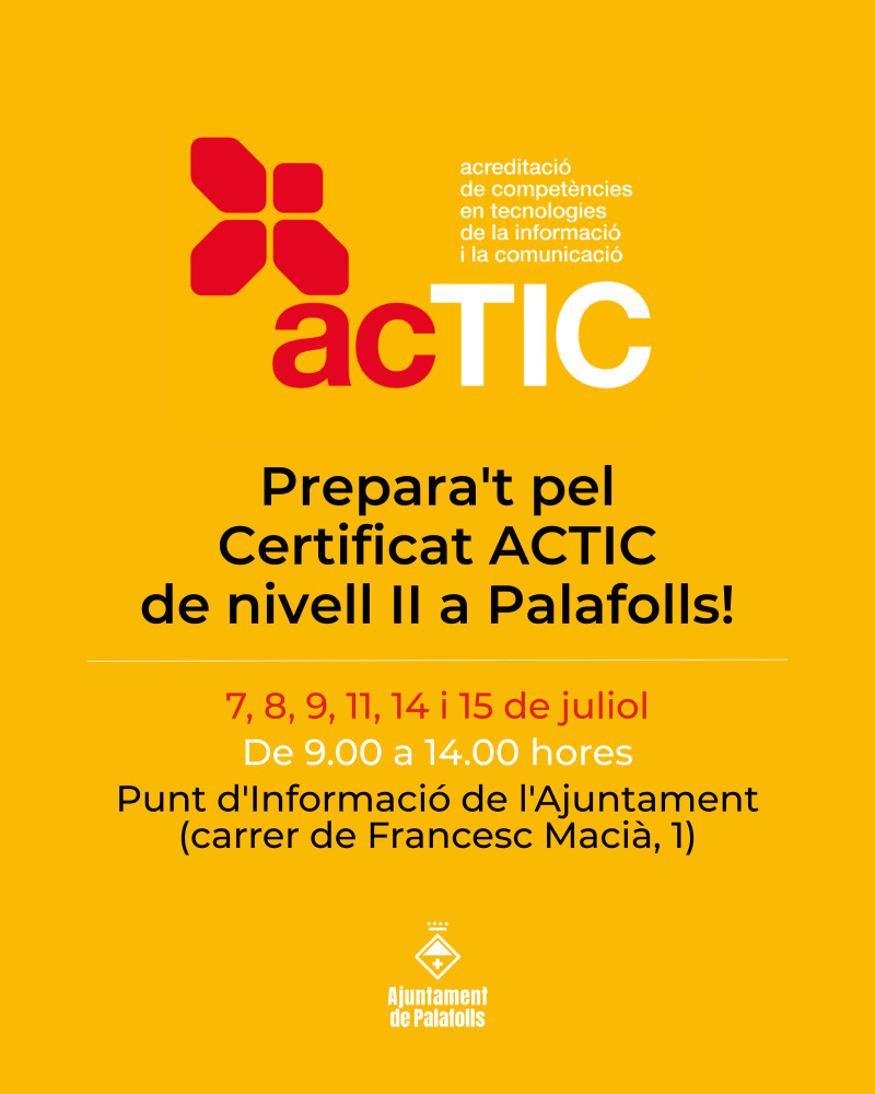 El Servei Local d'Ocupació de Palafolls organitza el curs "Prepara't pel certificat ACTIC (Nivell 2)", una formació dirigida a persones demandants d'ocupació i inscrites al servei municipal per tal de preparar la prova de nivell mig d'Acreditació de Competències en Tecnologies de la Informació i la Comunicació (ACTIC). La formació es durà a terme els dies 7, 8, 9, 11, 14 i 15 de juliol de 9.00 a 14.00 hores al Punt d'Informació de l'Ajuntament (carrer de Francesc Macià, 1). Per a inscriure-s'hi, les persones interessades ho poden fer fins el 30 de juny, inclòs. Aquesta gestió es pot realitzar de manera telemàtica, mitjançant la instància genèrica de la Seu Electrònica, o presencialment a l'Ajuntament de Palafolls, demanant cita prèvia a través del portal habilitat. L'assignació de les places es realitzarà per ordre d'inscripció de les persones inscrites, fins a un màxim de 15. Aquesta és una formació reconeguda per treballar a l'Administració pública i per la qual cal comptar, d'entrada, amb un nivell d'usuari/a d'informàtica mig i estar inscrit/a a la xarxa Xaloc de la Diputació de Barcelona.