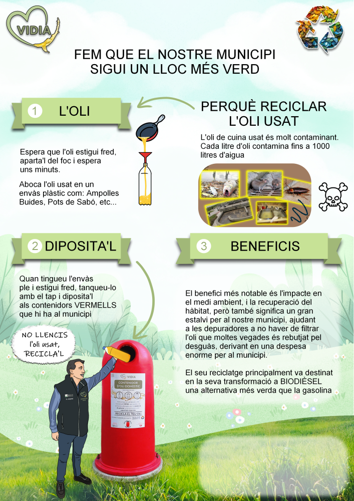 La recollida d’oli és possible gràcies a un conveni de col·laboració entre l’Ajuntament i l’Associació VIDIA, entitat sense ànim de lucre que no només gestiona la recollida i el reciclatge, sinó que desenvolupa un projecte social de gran rellevància: