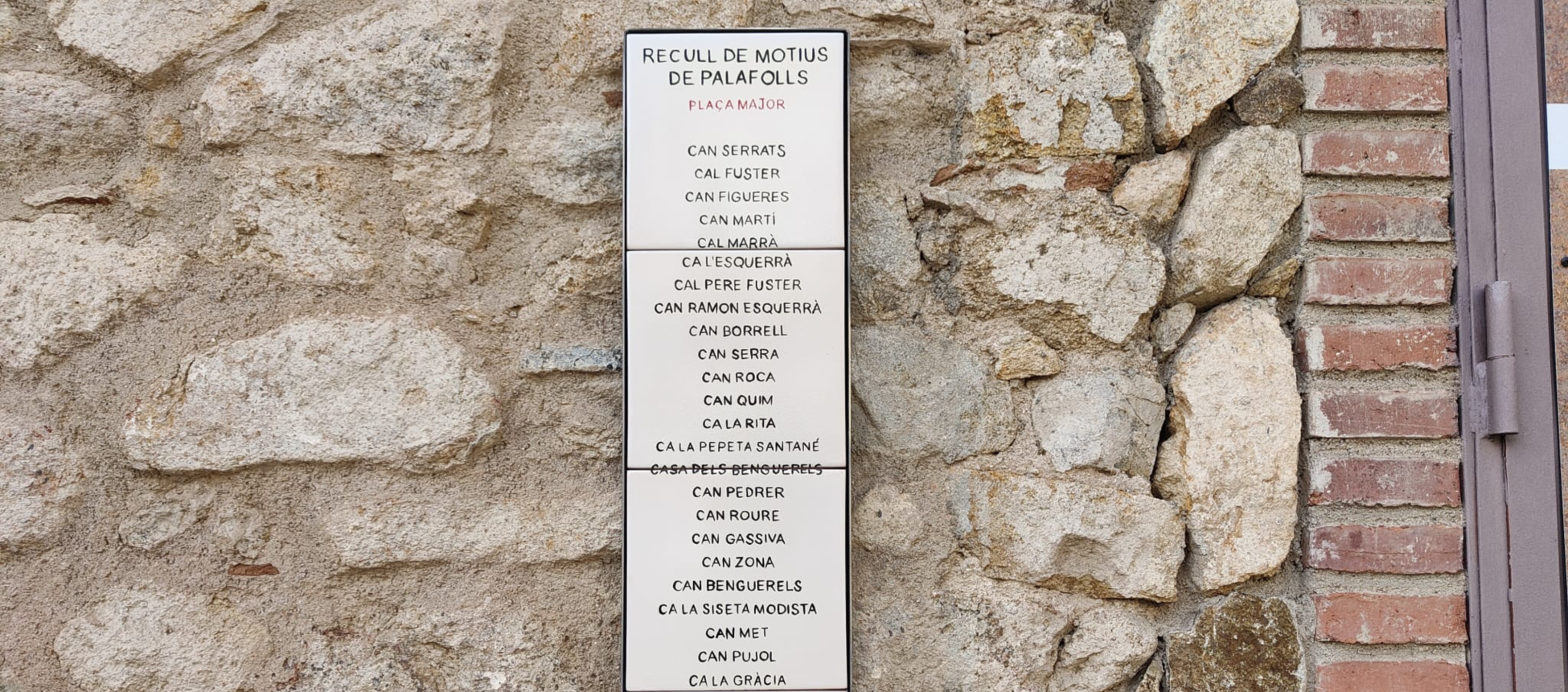 L'Ajuntament ha començat a instal·lar el recull de motius del municipi pels carrers de Palafolls. Es tracta de 10 conjunts de plafons ceràmics que inclouen els noms o malnoms amb els que s'han conegut algunes cases i/o famílies palafollenques durant anys, com ara Can Varisto, Ca l'Estevenet, Can Mingu Llop o Ca la Pepeta Telèfanus. La intenció del projecte és recuperar i posar en valor la memòria històrica de Palafolls. Des de l'arxiu municipal, s'ha volgut treballar per mantenir i salvaguardar aquest patrimoni immaterial local, que sovint ja no es transmet de generació en generació i, amb el temps, es pot arribar a perdre i oblidar-se. Les rajoles ceràmiques s'han incorporat en diferents punts del nucli antic: dues a Sant Genís de Palafolls, una a la zona de Mas Prats i set a Les Ferreries, localitzables en indrets com la plaça Major o el carrer Major, Passada, Mas Pinell o de baix. Aquesta iniciativa s'ha basat en el llibre "Cases amb eixida i hort. Aproximació als orígens urbans de Palafolls" de Xavier Salicrú, publicat l'any 2016 de manera conjunta amb el consistori, i ha comptat amb el suport econòmic de la Diputació de Barcelona.